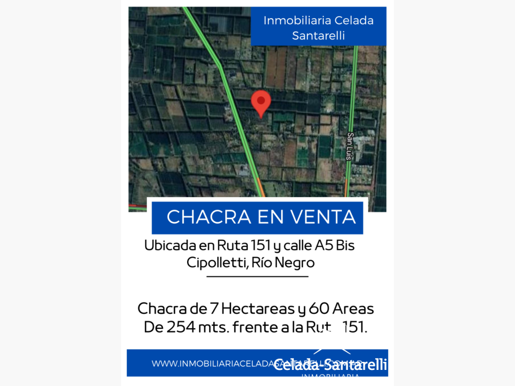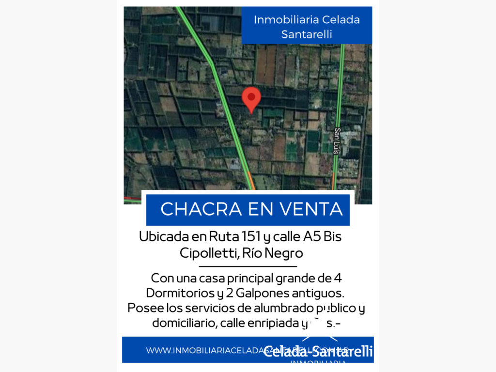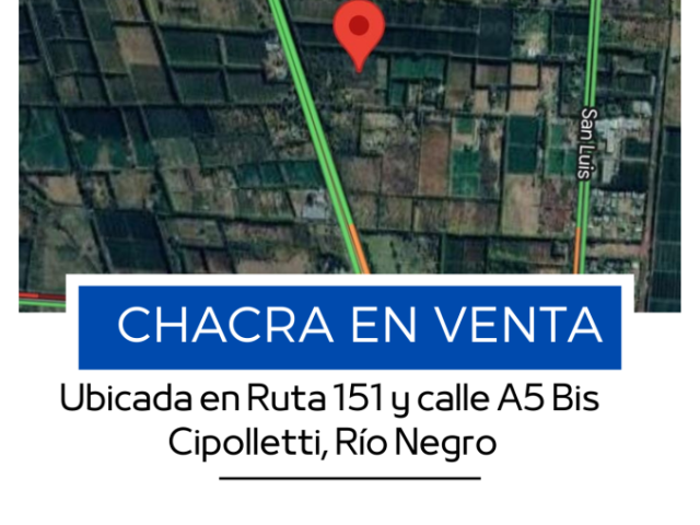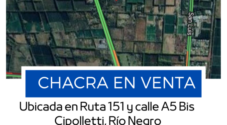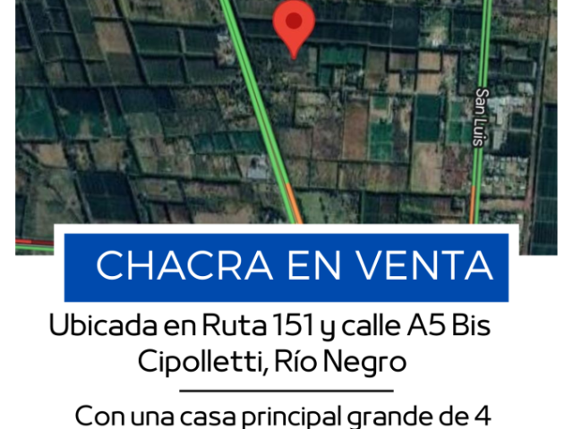 - Descripción: VENDO CHACRA, Ubicada en Ruta 151 y calle A5 Bis, en Cipolletti. De 254 metrso frente a la Ruta 151. Con un casa principal de 4 Dormitorios, Cocina, Comedor, Living, Baños, Lavadero, Hall de Recepcion, Biblioteca o Escritorio, Garage cubierto, 2 Galpones antiguos. Posee los servicios de alumbrado publico y domiciliario, calle enripiada y Gas.-
